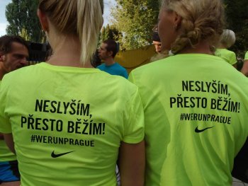 Každý slyšící i neslyšící účastník měl na zádech své vlastní motto. Mohli jste tak zahlédnout slečnu, která si Běží pro hezčí zadek, nebo se dozvědět, že I doktoři umí běhat. Nás ale nejvíce zajímala skupinka běžců s nápisem Neslyším, přesto běžím!
