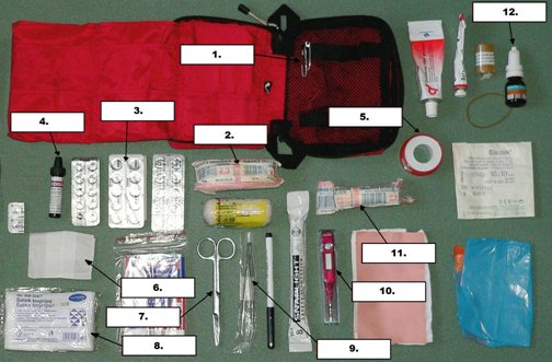 obvaz, trojcípý šátek, hladká náplast, náplast s polštářkem, obinadlo, zavírací špendlíky, nůžky, léky, teploměr, oční kapky, jódová tinktura (Jodisol), pinzeta